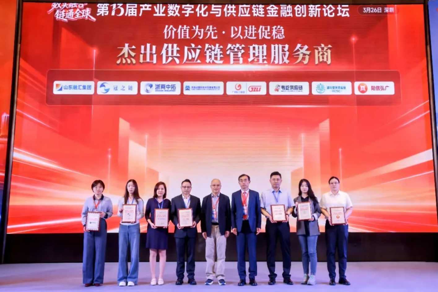 3月26日,第十三届产业数字化与供应链金融创新论坛在深圳隆重召开。联投湖北楚菜供应链有限公司荣获“2026年度供应链服务生态杰出供应链管理服务商”称号。