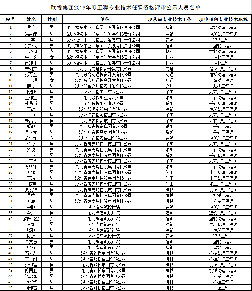 附件:联投集团2019年度工程专业技术任职资格评审公示人员名单